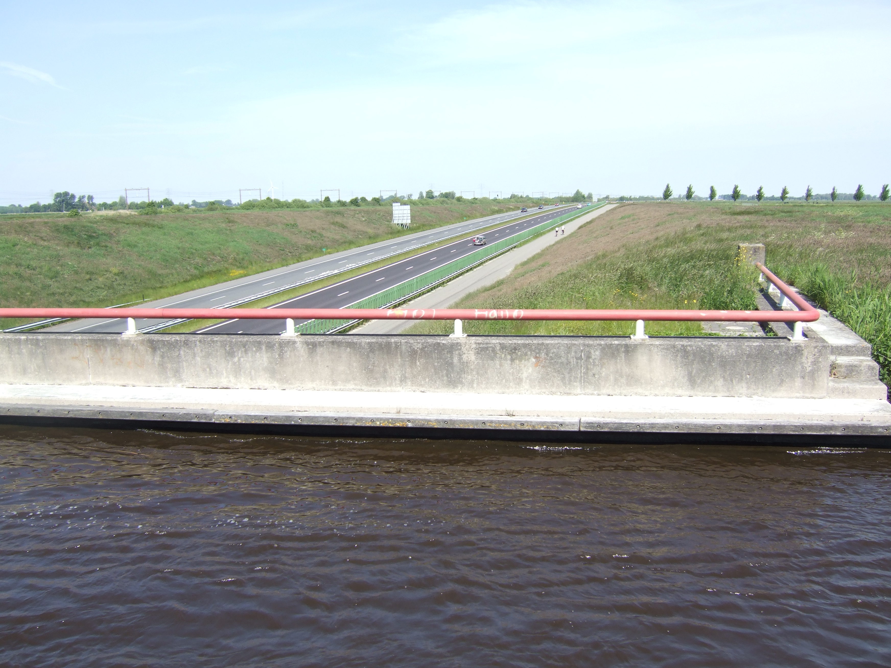 Kurz nach Akkrum befahren wir einen Aquädukt. Es ist schon eine verkehrte Welt: Oben im Kanal fahren wir mit unserer "Linda" und unter uns auf der A32 die Autos:
